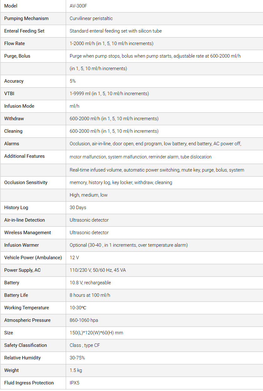 Real-time infused volume, automatic power switching, mute key, purge, bolus, system memory, history log, key locker, withdraw, cleaning.